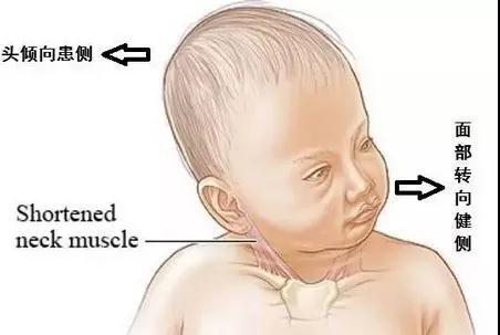 婴儿出生后其母亲可发现患儿头部向患侧倾斜,面部向健侧旋转,下颌指向健侧肩部,2~3周后斜颈畸形更加明显,将头转向健侧明显受限。症状较轻者应仔细观察才能发现,此症状随着患儿的生长发育日益加重。